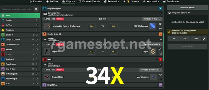 O 34X oferece uma grande seleção de opções de apostas em e-sports com probabilidades competitivas